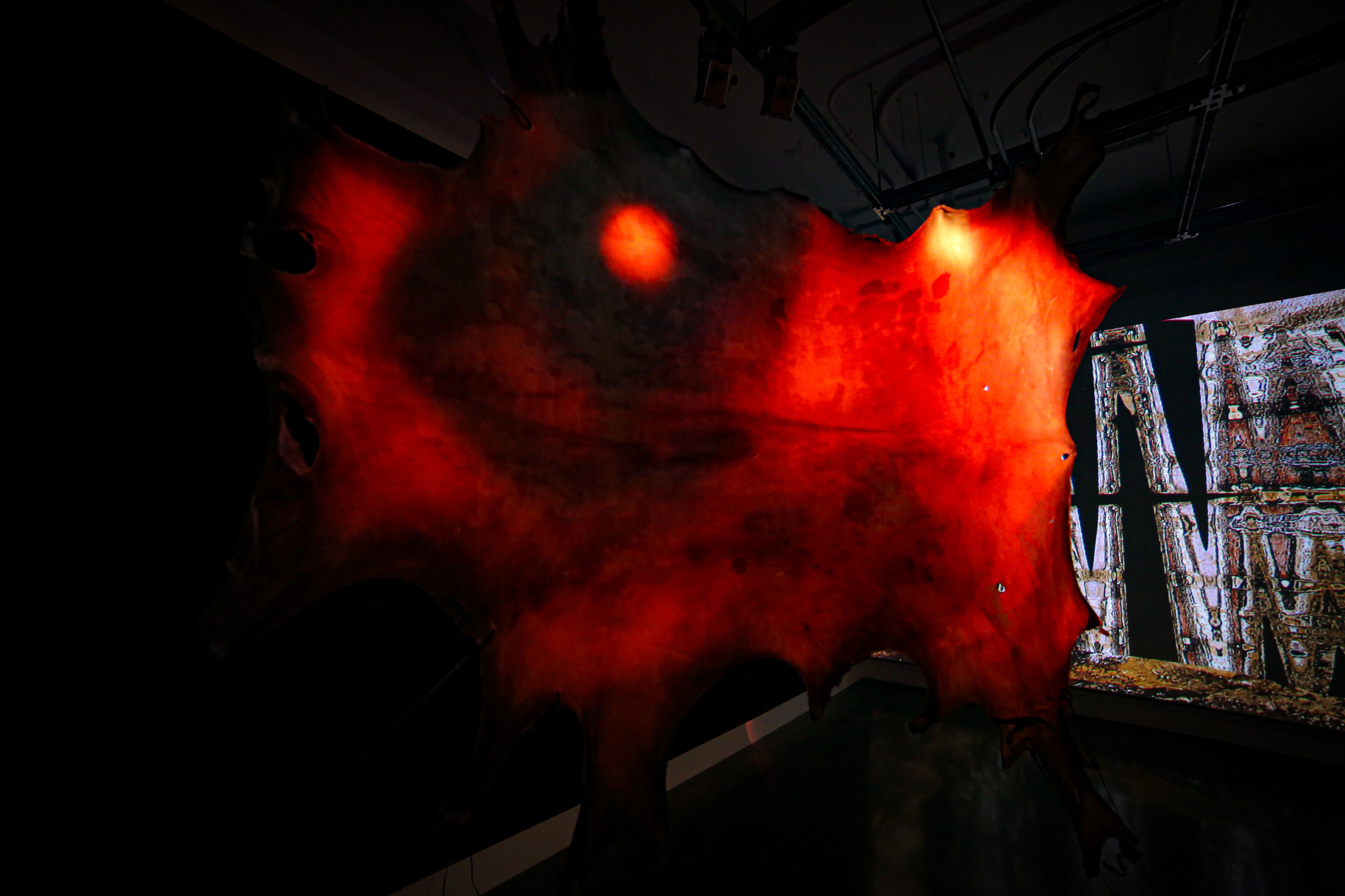 Installation view. Cowhide, metal wire, steel screw eye hook, brick, rock, video projection